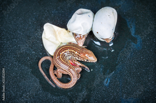 © bozhdb, Naklejka premium Little Sand lizards hatching from an eggs, selective focus
