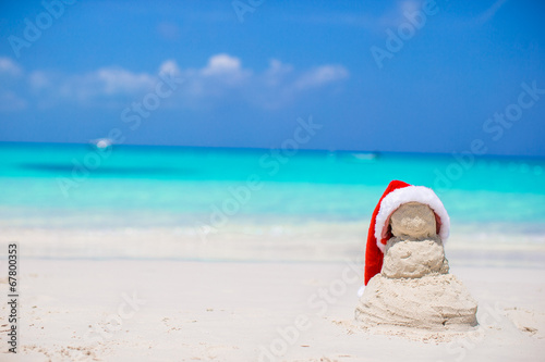 Obraz premium Little sandy snowman with red Santa Hat on white Caribbean beach