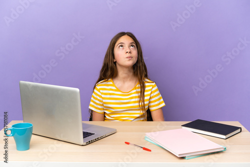 © luismolinero, Naklejka premium Little student girl in a workplace with a laptop isolated on purple background and looking up