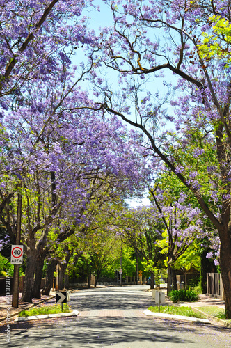 Naklejka premium Little suburban street full of green trees and blooming jacaranda. Adelaide, Australia
