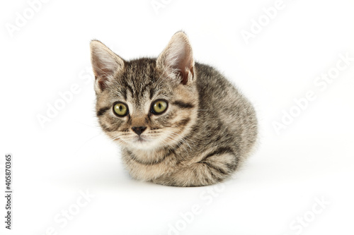 Obraz premium Little tabby (European Shorthair) kitten isolated on white background.