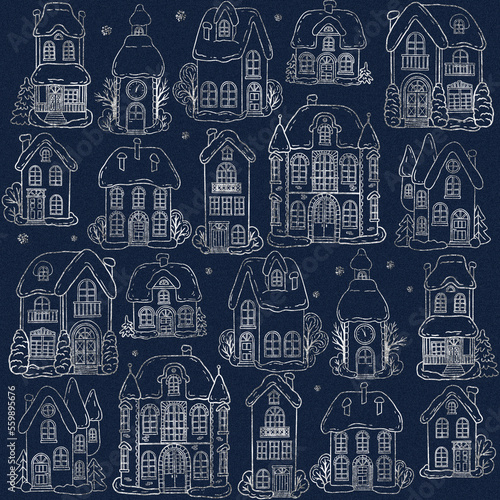 © Hanna Symonovych, Fototapeta premium Little town streets in winter. Digital hand drawn illustration. Seamless pattern ornament with holiday theme