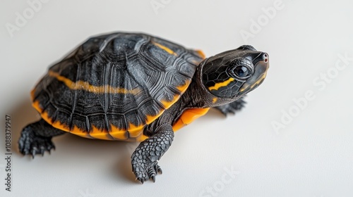 Fototapeta premium Little turtle crawling forward slowly on white background