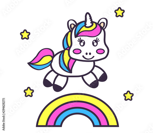 © alina_polina, Naklejka premium Little unicorn on the rainbow. Vector illustration.