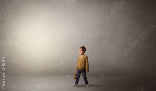 Obraz premium Little waggish kid staying alone in a big empty room with his plush