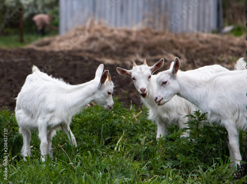 © Evgeniy, Fototapeta premium little white goat with a funny muzzle is grazed on a meadow
