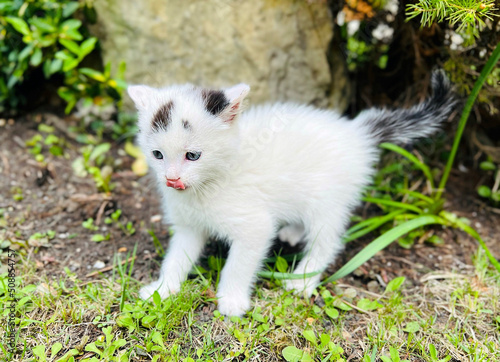 © Andrii Yalanskyi, Fototapeta premium Little white kitten shows tongue. Playful pet. Selective focus