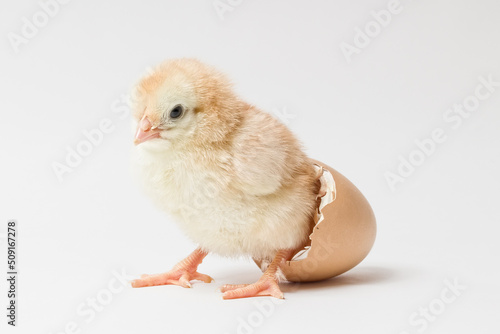 Fototapeta premium little yellow chick sits in an eggshell on a white background