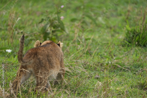 © Soaps, Obraz premium little young lion cub walking away from the camera on the green grass of the serengeti national park tanzania