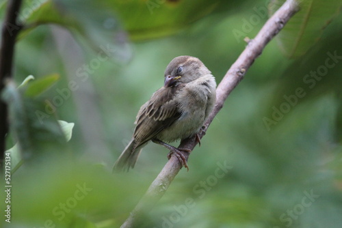 © Suyambu, Fototapeta premium Little young sparrow sleep on the green tree branch