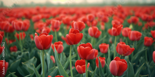 Obraz premium Lively fresh tulip fields, vivid green foliage and bright red tulip flowers.