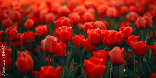 © Ice Cream Paradise, Fototapeta premium Lively fresh tulip fields, vivid green foliage and bright red tulip flowers