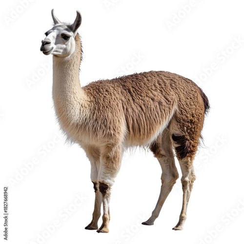 © Zainab, Naklejka premium Lively llama stands proudly in a snowy field during sunny winter afternoon.