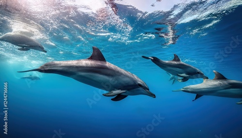 © netsay, Obraz premium Lively Pod of Dolphins Playing Underwater, Exploring a Pristine Blue Ocean Depth, Showcasing Joy and Grace in an Amazing Aquatic Ballet