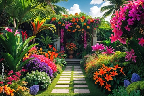 Fototapeta premium Lively Tropical Summer Garden Filled with Colorful Flowers and Vibrant Plants