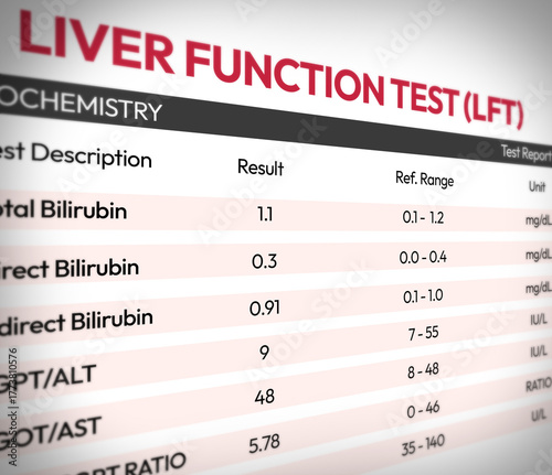 © visuals6x, Obraz premium Liver Function Test LFT report showing from the side, billirubin values concept medical health backdrop