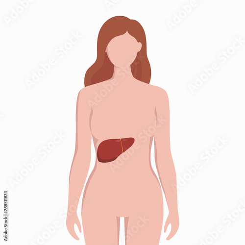 © Bezvershenko, Fototapeta premium Liver on woman body silhouette vector medical illustration isolated on white background. Human inner organ placed in bady infographic elements in flat design.