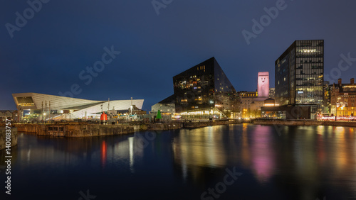 Naklejka premium Liverpool Waterfront Modern Architecture and Reflections at Night