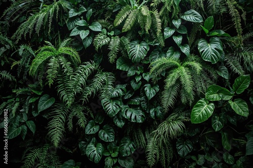 © The 2R Artificiality, Fototapeta premium Living green wall featuring devil's ivy, ferns, philodendron, peperomia, inch plant, and diverse tropical foliage against a dark backdrop