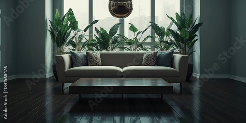 © TheWaterMeloonProjec, Obraz premium Living room in a contemporary apartment featuring cozy seating, a wooden table, and potted plants by the window, focused on interior design