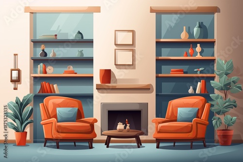 © juliars, Fototapeta premium Living room interior designed for comfort and relaxation with a fireplace and two armchairs