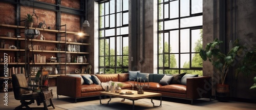 Fototapeta premium Living room interior in loft, industrial style, 3d render