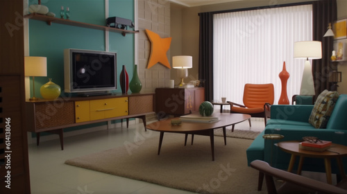 Fototapeta premium Living room interior in retro design with vibrant colors