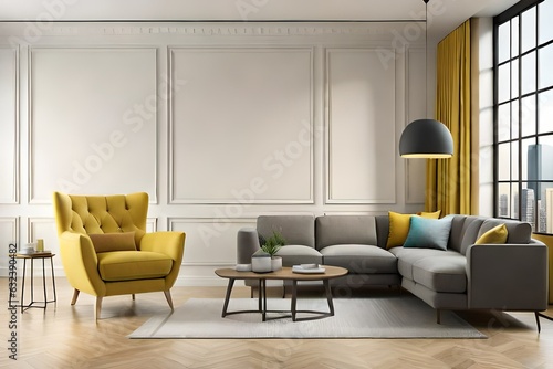 © Nyetock, Fototapeta premium Living room interior wall mock up with yellow armchair on empty cream color wall background. 3d rendering. Template