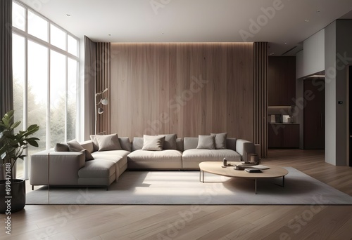 Fototapeta premium Living room interior with fabric armchair, lamp, book, and plants on empty...