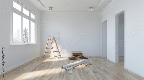 © fotogurme, Obraz premium ''living room renovation, walls being painted, new furniture pieces waiting to be assembled, bright and airy space, modern design''