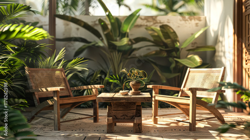 © Алла Морозова, Obraz premium Living room with a wooden table and two chairs.