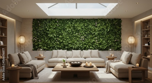 Fototapeta premium Living room with green wall and skylight featuring sofas tables and decorative items in a serene setting
