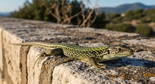 © Leny, Naklejka premium Lizard basking in sunlight on a stone wall, nature scene.