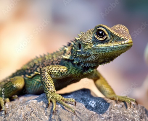 Fototapeta premium Lizard basking on a rock under soft sunlight showcasing vibrant green colors