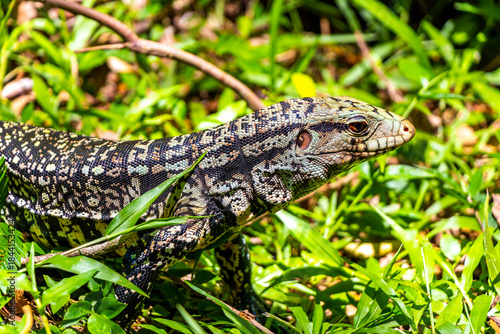 Fototapeta premium Lizard gecko iguana reptile on ground and grass in Brazil.