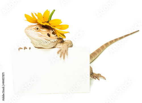 © zakrevski, Obraz premium lizard holding card in hand on white