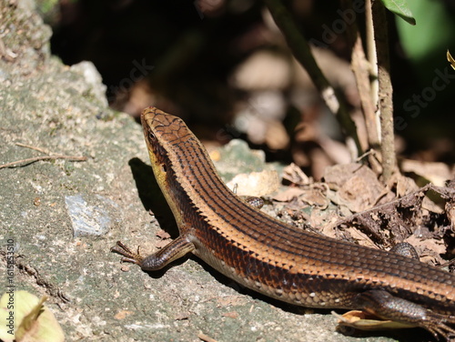 Naklejka premium Lizard on Stone: A close-up shot of a sleek lizard basking on a rough, textured stone in its natural habitat, blending seamlessly with its surroundings.