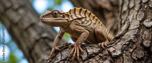 © VirtualVista, Obraz premium Lizard perched on a tree trunk displaying intricate textures and colors in a natural habitat setting amidst blurred foliage.