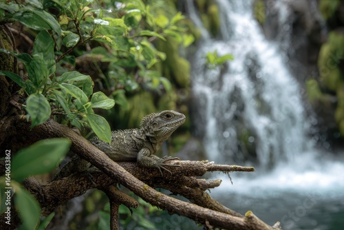 Obraz premium Lizard resting on branch near tranquil waterfall surrounded by vibrant...