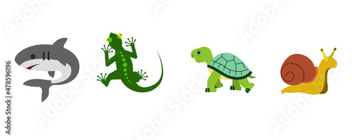 © Firangiz, Naklejka premium Lizard, shark, tirtle, snail vector flat icon.