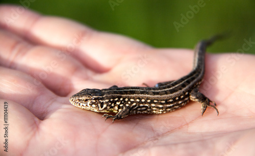 © kolesnikovserg, Fototapeta premium lizard sitting on a palm close up