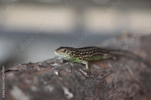 © Ilona Didkovska, Naklejka premium Lizard sitting on brown stone enjoying morning sun