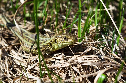 Fototapeta premium Lizard standing in grass in a sunny day, under a hard sun. Quick lizard, or...