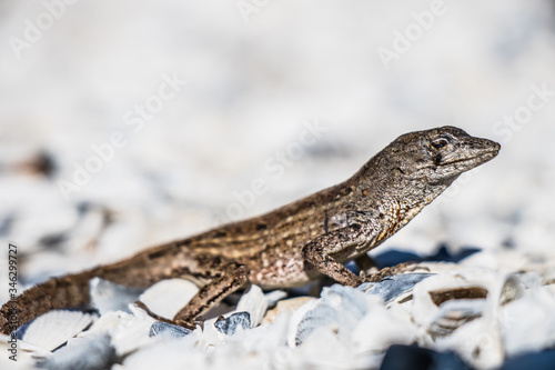 © Corbin, Fototapeta premium Lizard sunbathing on white shells