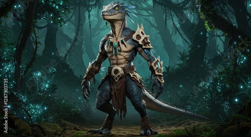 Fototapeta premium Lizard Warrior Standing in Mystic Forest with Armor and Decorations