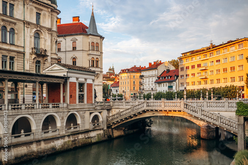 © Andrei Antipov, Naklejka premium Ljubljana, Slovenia - 14 August 2024: Preseren Square, the central square in Ljubljana. It is part of the old town pedestrian zone and a major meeting point