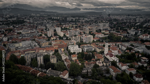 © Belus, Fototapeta premium Ljubljana, Slovenia city center view from above. Green capital of Europe. An aerial view drone photo.