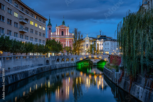 Obraz premium Ljubljana, Slovenia - Ljubljanica river canal, Triple bridge and Franciscan...