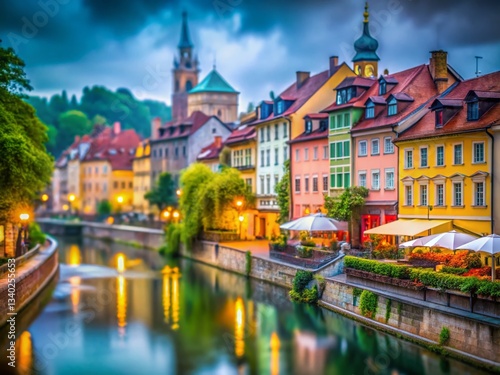 © Sirinporn, Fototapeta premium Ljubljana, Slovenia: Rainy Day Tilt-Shift Photography - Charming Cityscape
