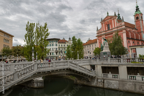 Naklejka premium Ljubljana,Slovenia,6,2016: Street, river, bridges with dragons, magical city.